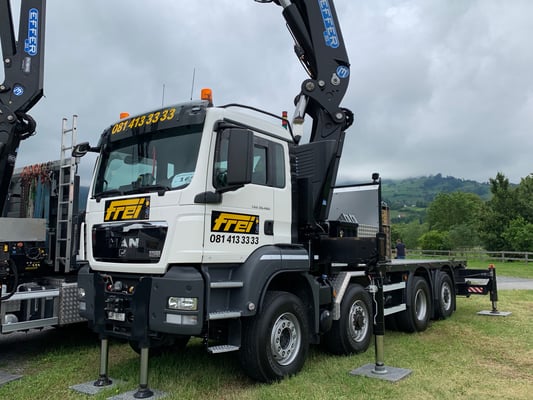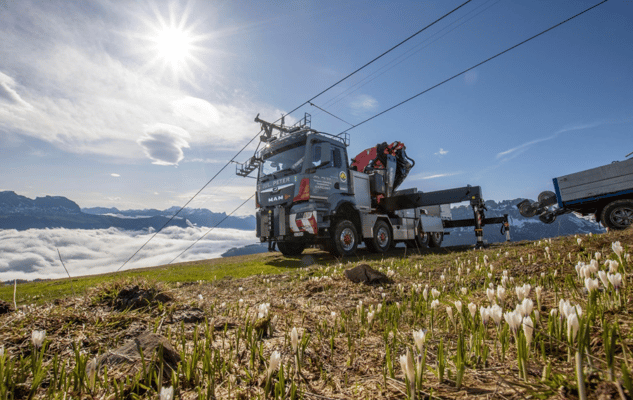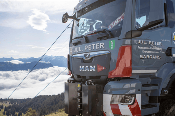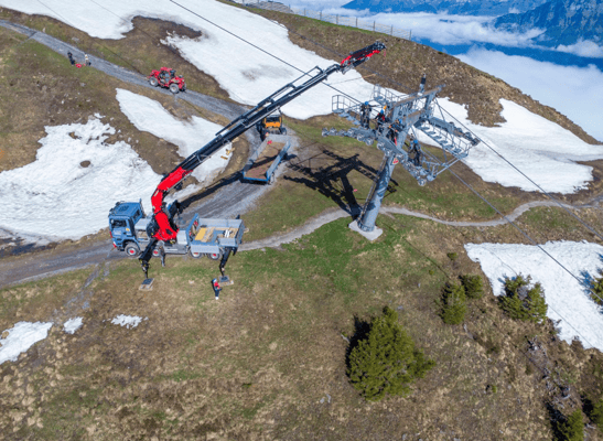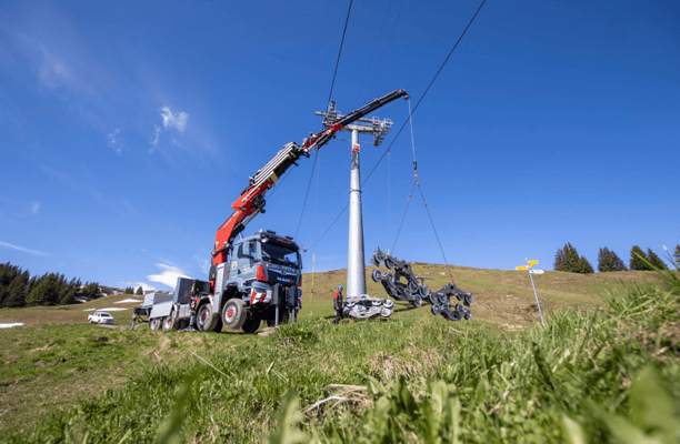 In periodischen Intervallen werden die Skilifte der Bergbahnen Flumserberg geprüft und revidiert. Mit dem Spezialfahrzeug konnten die für die Revision abmontierten Rollenbatterien wieder an die Seilbahnmasten angebracht werden. Mit seinen drei angetriebenen Achsen und der hintersten, die sogar gelenkt ist, kombiniert das Kranfahrzeug die für solche Arbeiten immens wichtigen Fähigkeiten von Kraft und Wendigkeit.