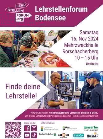 Am Samstag, 16. November 2024 sind wir von 10 - 15 Uhr am Lehrstellenforum Bodensee in der Mehrzweckhalle im Rorschacherberg anzutreffen.