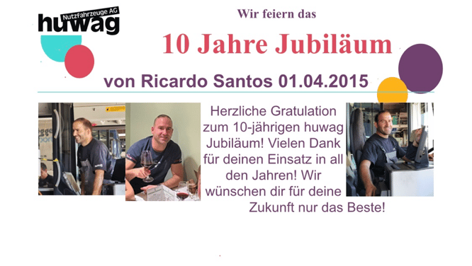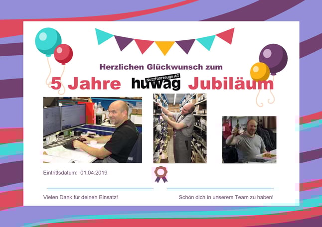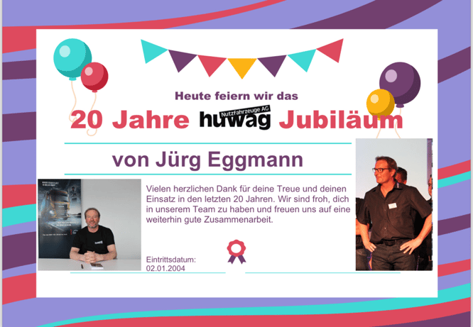Herzlichen Dank für deine Loyalität und deinen Einsatz in all den Jahren. Du bist aus der huwag nicht mehr wegzudenken und wir hoffen auf noch viele weitere Jahre erfolgreiche Zusammenarbeit!