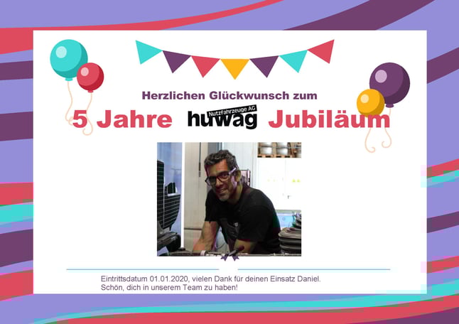 Herzliche Gratulation zu deinem Firmenjubiläum und vielen Dank für deinen Einsatz in den letzten Jahren.
